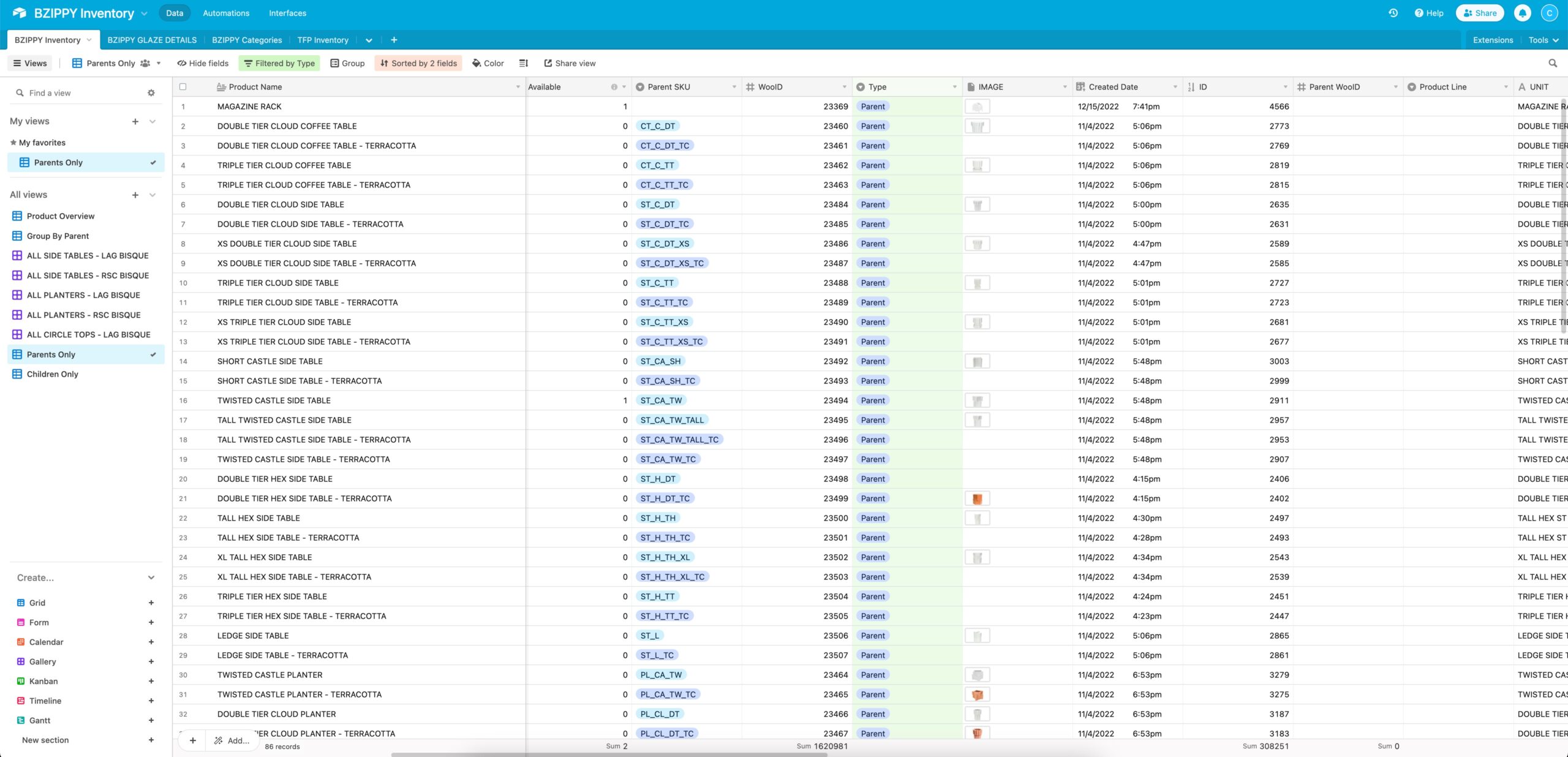 Currently supporting a single warehouse, the Inventory table manages qty available, on sales order, and an inventory allocation for the WooCommerce store. As orders are placed, the inventory levels are adjusted via webhooks and Airtable Automations. BZIPPY can also reserve quantities as needed for larger orders or buffering to avoid overselling online.
