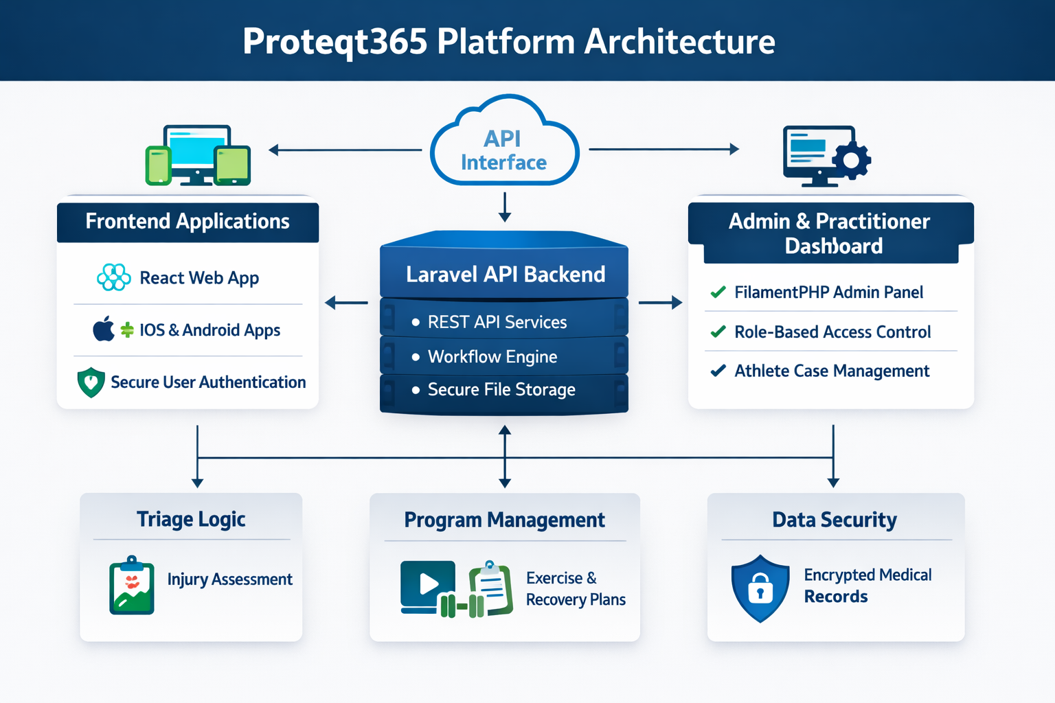 My Project Solution partnered with the Proteqt365 team to architect and build a fully custom platform that combines a modern web application, mobile apps, and an advanced clinical workflow engine. The system enables families to quickly assess sports-related injuries, receive structured guidance, and access customized recovery and performance programs.