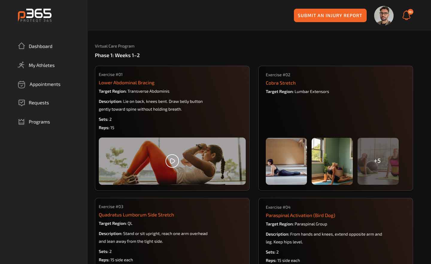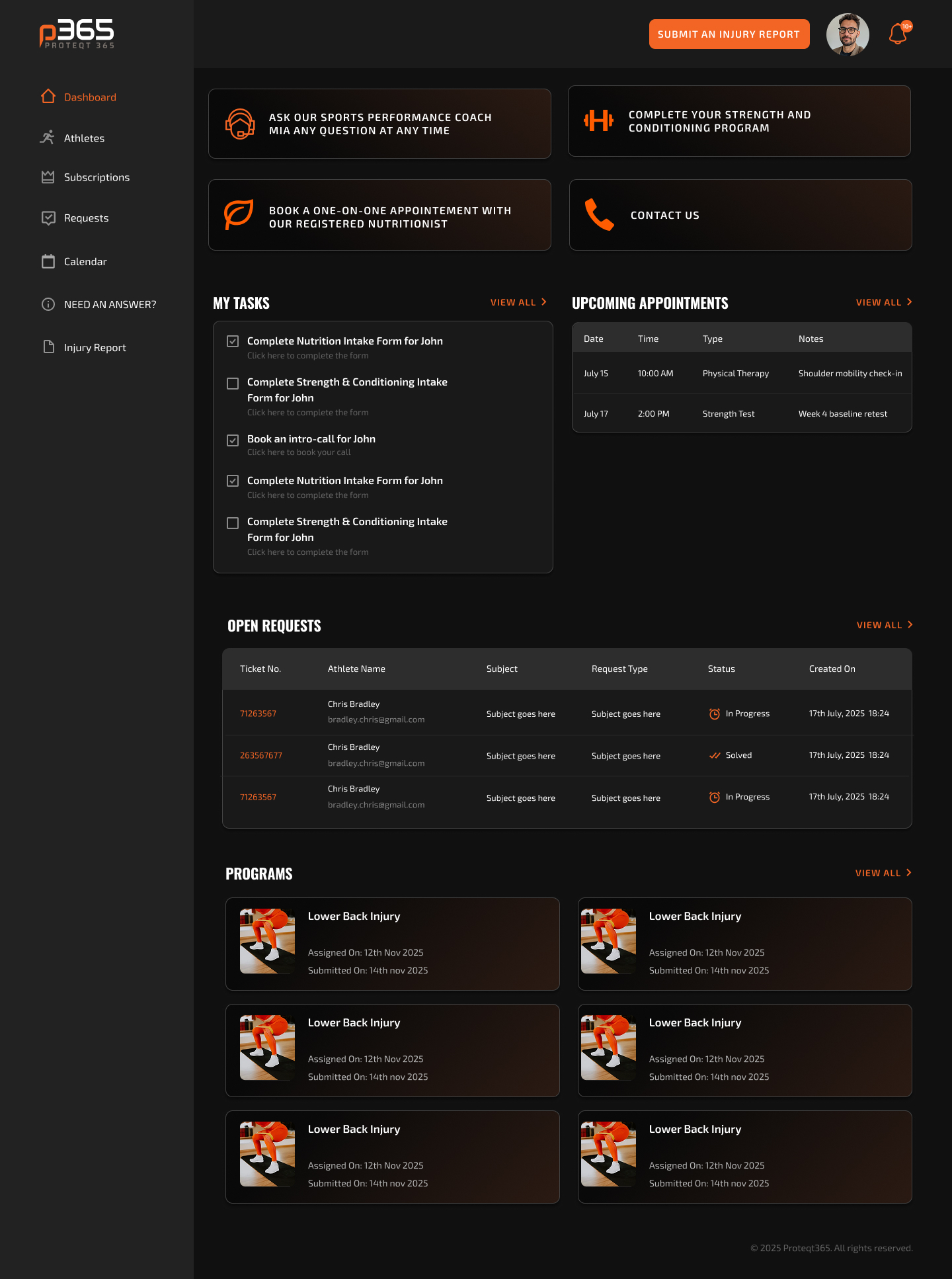 Proteqt365 is a comprehensive digital platform designed to help parents, youth athletes, and sports performance professionals manage injury triage, recovery programs, and performance education.